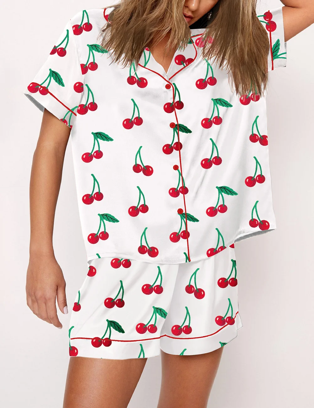 Women’s Cherry Cute Print Short Sleeve Satin Pajama Set