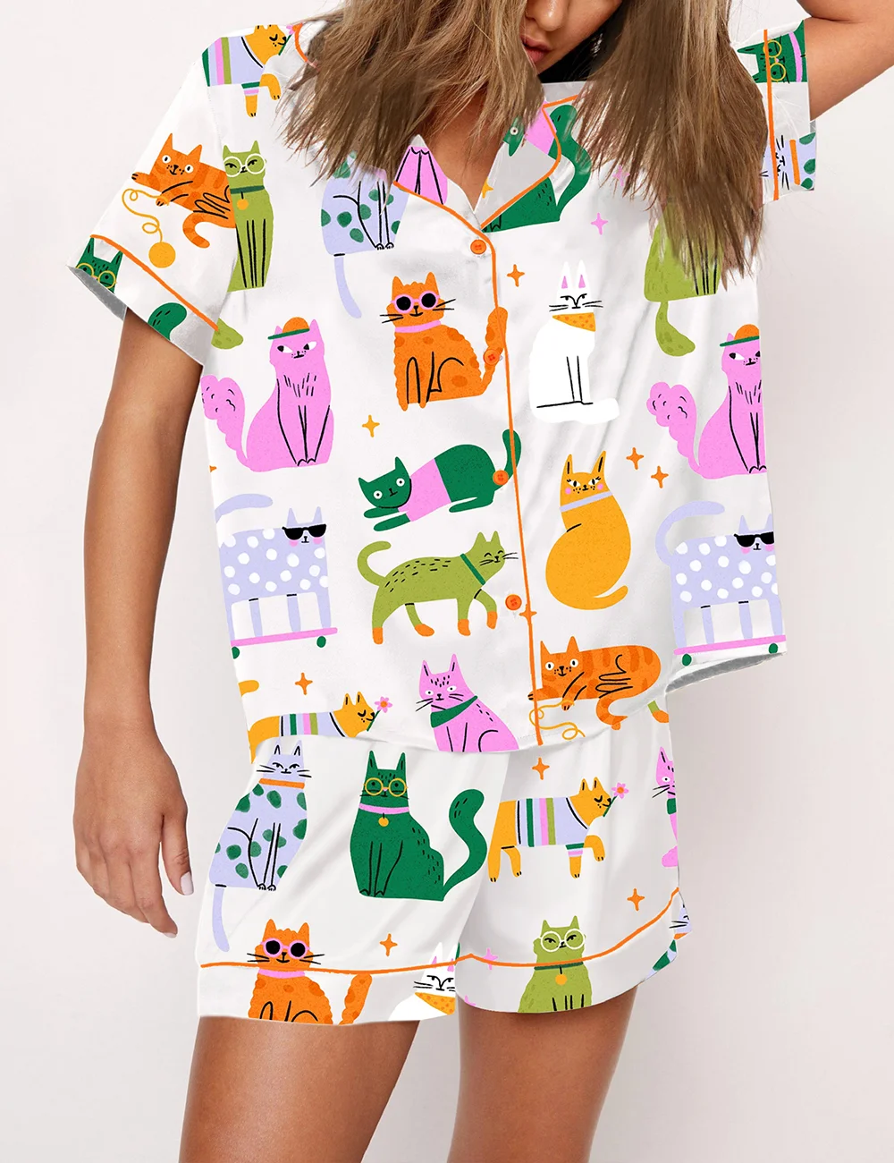 Women’s Colorful Cat Art Print Short Sleeve Satin Pajama Set