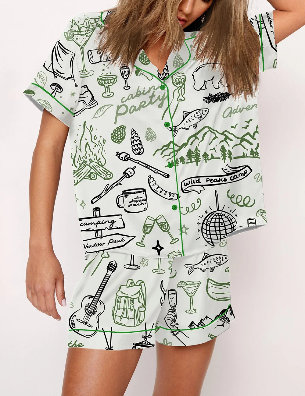 Women’s Outdoor Whimsical Style Hand Drawn Cabin Party Camping Wilderness Print Short Sleeve Satin Pajama Set