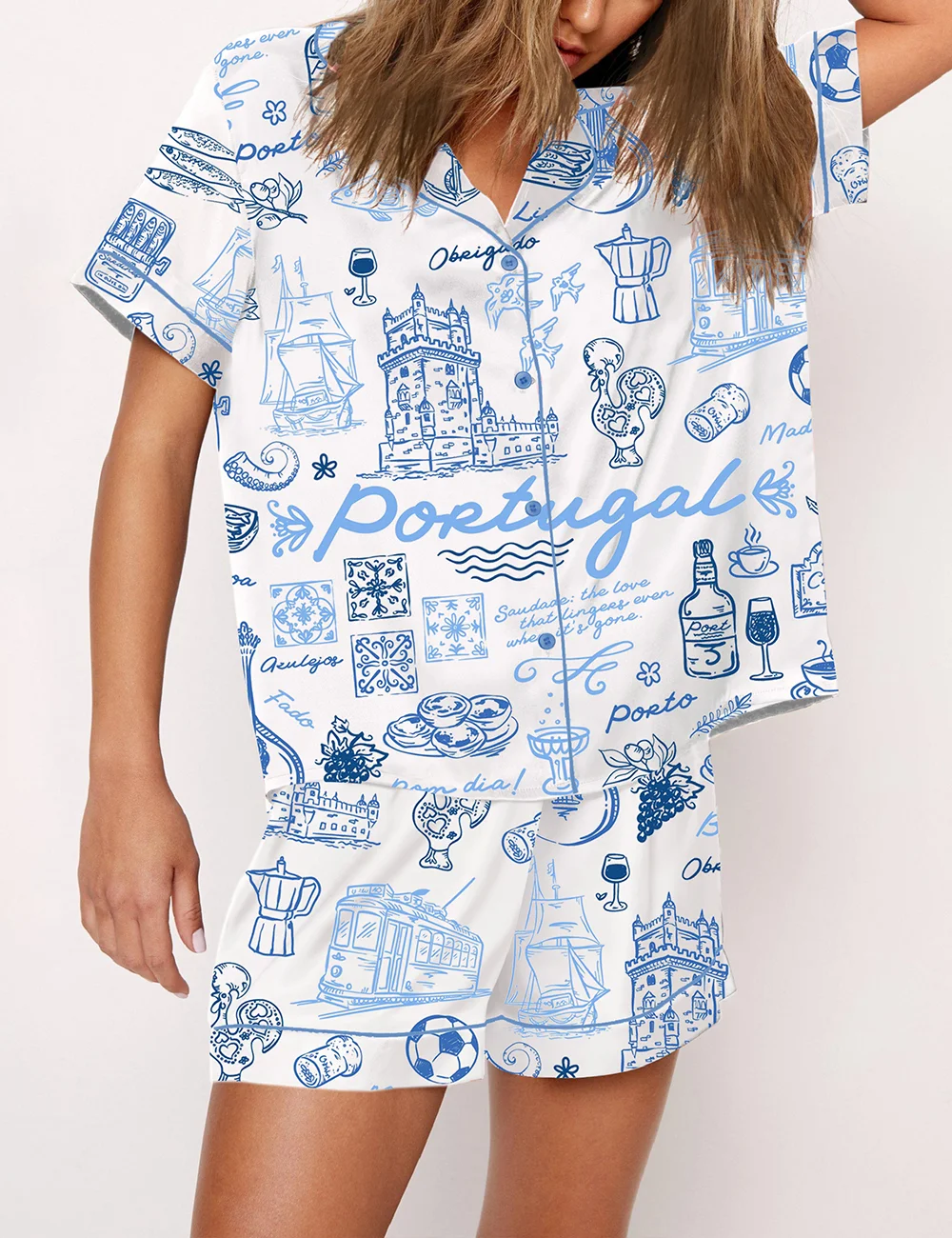 Women’s Portugal Whimsical Style Illustration Short Sleeve Satin Pajama Set
